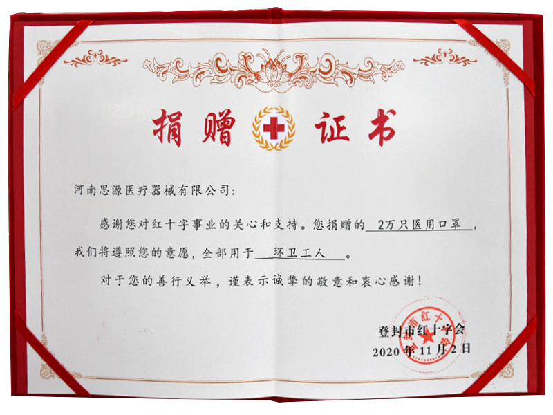 登封紅十字會捐贈證書